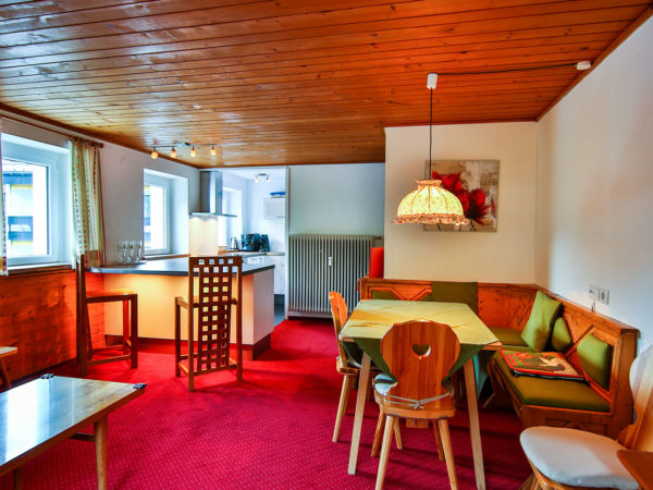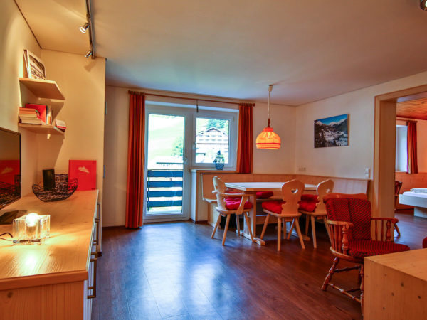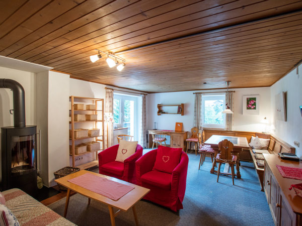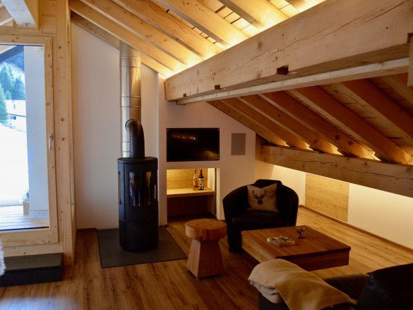 Modernes Appartement (2-6 Personen, 74 m²) Wohnzimmer gemütlich volkstümlich eingerichtet mit Holzofen, Eicheneckbankgarnitur mit großem Montafon-Tisch, komfortables Sofabett, zwei separate Schlafzimmer mit je 3 Betten, Flur mit Garderobe,...