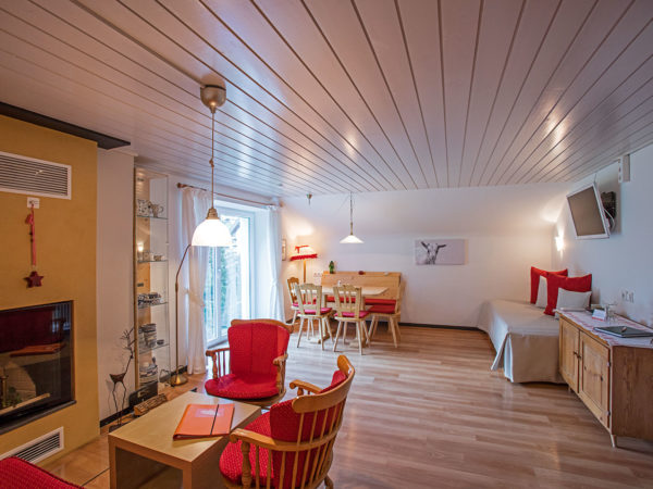 Modernes Appartement (2-6 Personen, 68m²) Wohnbereich mit Kamin, Flachbildfernseher (inkl. Sky Sports), Sofa-Doppelbett, sehr große Terrasse mit Garten, Schlafzimmer mit Doppelbett, zusätzliches Bett sowie Schlafsessel, Balkon, Badezimmer mit...