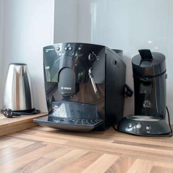 Gemütlicher Wohn-/Schlafbereich mit einer komfortablen Doppelbett-Couch, Flachbildfernseher, große offene Küche mit Theke, Spülmaschine, Gefrier-Kühlschrank, Ofen mit Mikrowelle, Balkon. Ein Schlafzimmer hat ein Doppelbett, das andere zwei Einzelbetten und ein Waschbecken, ein Duschbad mit Toilette und Flur.
